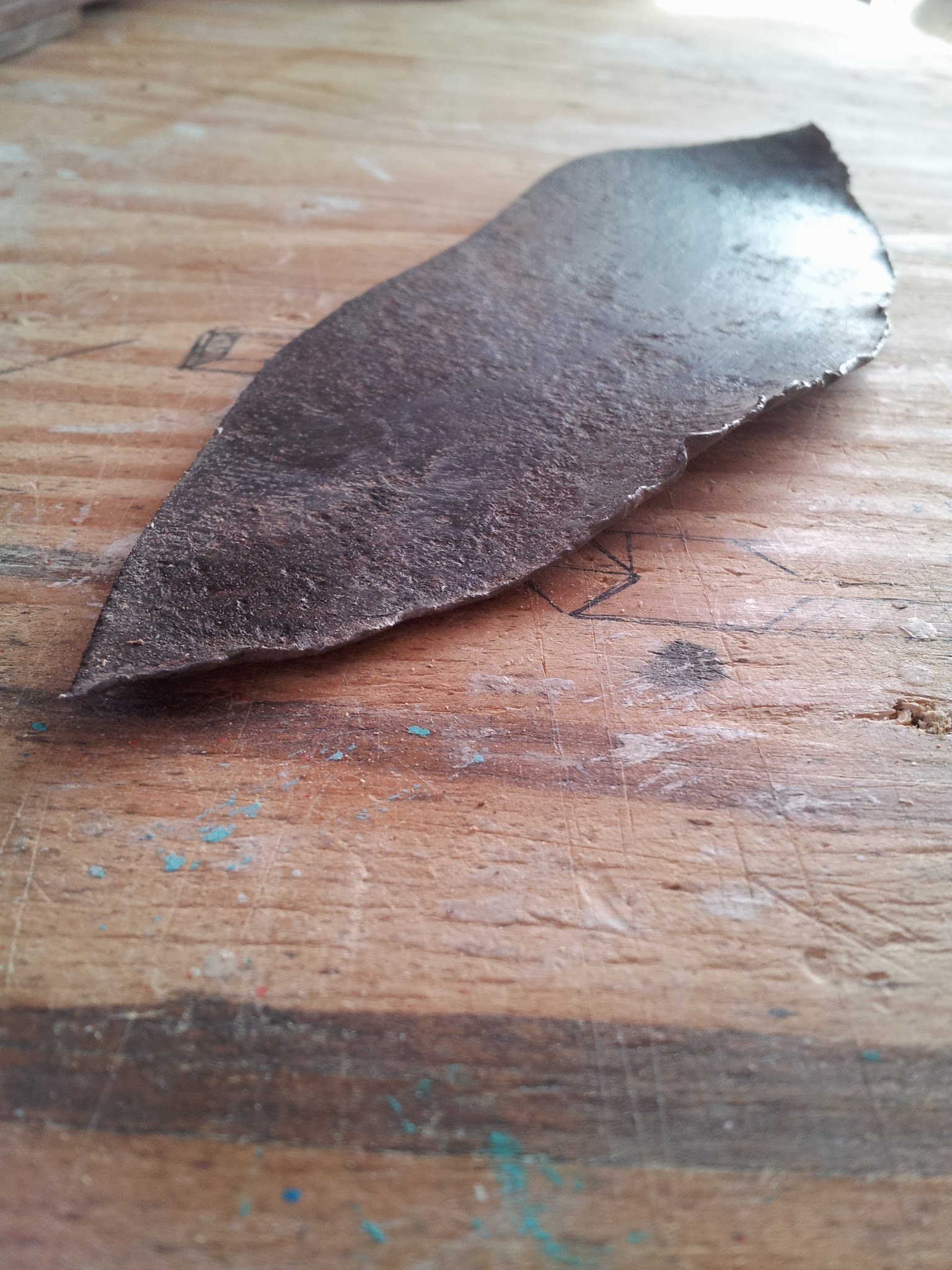 One of a kind knife that would be great for camping or pillaging. Made from found metal and Brazilian hard wood.